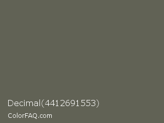 Decimal 4412691553 Color is a normal yellow color and the nearest color is Chicago #5d5c58. Hex code #616255 and RGB value is rgb(97,98,85). In RGB color space, this color is composed of 38% red, 38% green, 33% blue, In CMYK color space, this color is composed of 1% cyan, 0% magenta, 13% yellow , 62% black , In HSL color space, this color has a hue angle of 65° , 7% saturation and 36% lightness.