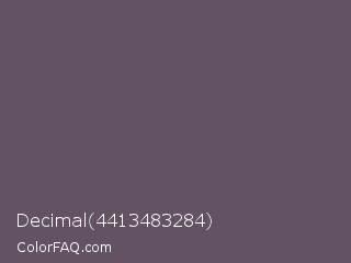 Decimal 4413483284 Color is a normal magenta color and the nearest color is Scarpa Flow #585562. Hex code #625262 and RGB value is rgb(98,82,98). In RGB color space, this color is composed of 38% red, 32% green, 38% blue, In CMYK color space, this color is composed of 0% cyan, 16% magenta, 0% yellow , 62% black , In HSL color space, this color has a hue angle of 300° , 9% saturation and 35% lightness.