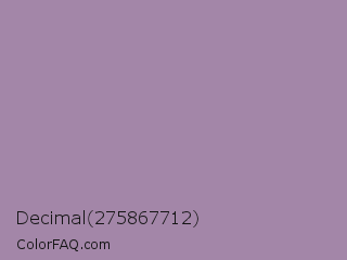 Decimal 275867712 Color is a normal purple color and the nearest color is Bouquet #ae809e. Hex code #a386a8 and RGB value is rgb(163,134,168). In RGB color space, this color is composed of 64% red, 53% green, 66% blue, In CMYK color space, this color is composed of 3% cyan, 20% magenta, 0% yellow , 34% black , In HSL color space, this color has a hue angle of 291° , 16% saturation and 59% lightness.