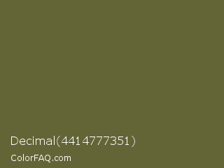 Decimal 4414777351 Color is a normal yellow color and the nearest color is Verdigris #5d5e37. Hex code #646537 and RGB value is rgb(100,101,55). In RGB color space, this color is composed of 39% red, 40% green, 22% blue, In CMYK color space, this color is composed of 1% cyan, 0% magenta, 46% yellow , 60% black , In HSL color space, this color has a hue angle of 61° , 29% saturation and 31% lightness.