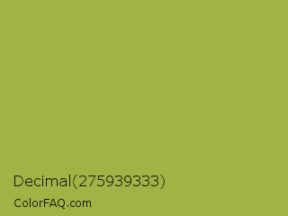 Decimal 275939333 Color is a normal yellow color and the nearest color is Brass #b5a642. Hex code #a3b245 and RGB value is rgb(163,178,69). In RGB color space, this color is composed of 64% red, 70% green, 27% blue, In CMYK color space, this color is composed of 8% cyan, 0% magenta, 61% yellow , 30% black , In HSL color space, this color has a hue angle of 68° , 44% saturation and 48% lightness.