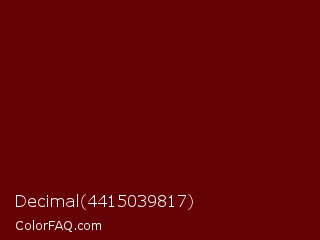 Decimal 4415039817 Color is a very dark red color and the nearest color is Rosewood #65000b. Hex code #650205 and RGB value is rgb(101,2,5). In RGB color space, this color is composed of 40% red, 1% green, 2% blue, In CMYK color space, this color is composed of 0% cyan, 98% magenta, 95% yellow , 60% black , In HSL color space, this color has a hue angle of 358° , 96% saturation and 20% lightness.