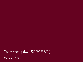 Decimal 4415039862 Color is a very dark rose color and the nearest color is Bordeaux #5c0120. Hex code #650220 and RGB value is rgb(101,2,32). In RGB color space, this color is composed of 40% red, 1% green, 13% blue, In CMYK color space, this color is composed of 0% cyan, 98% magenta, 68% yellow , 60% black , In HSL color space, this color has a hue angle of 342° , 96% saturation and 20% lightness.