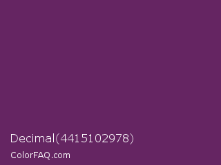 Decimal 4415102978 Color is a dark magenta color and the nearest color is Palatinate Purple #682860. Hex code #652562 and RGB value is rgb(101,37,98). In RGB color space, this color is composed of 40% red, 15% green, 38% blue, In CMYK color space, this color is composed of 0% cyan, 63% magenta, 3% yellow , 60% black , In HSL color space, this color has a hue angle of 303° , 46% saturation and 27% lightness.