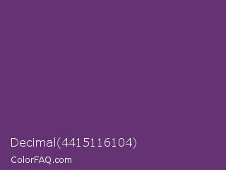 Decimal 4415116104 Color is a normal purple color and the nearest color is Imperial #602f6b. Hex code #653274 and RGB value is rgb(101,50,116). In RGB color space, this color is composed of 40% red, 20% green, 45% blue, In CMYK color space, this color is composed of 13% cyan, 57% magenta, 0% yellow , 55% black , In HSL color space, this color has a hue angle of 286° , 40% saturation and 33% lightness.