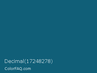 Decimal 17248278 Color is a dark blue color and the nearest color is Blue Sapphire #126180. Hex code #105f78 and RGB value is rgb(16,95,120). In RGB color space, this color is composed of 6% red, 37% green, 47% blue, In CMYK color space, this color is composed of 87% cyan, 21% magenta, 0% yellow , 53% black , In HSL color space, this color has a hue angle of 194° , 76% saturation and 27% lightness.