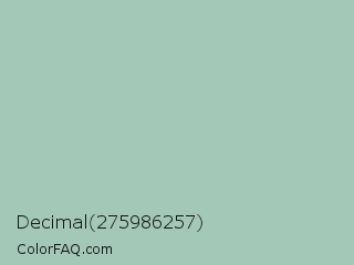 Decimal 275986257 Color is a light green color and the nearest color is Shadow Green #9ac2b8. Hex code #a3c8b7 and RGB value is rgb(163,200,183). In RGB color space, this color is composed of 64% red, 78% green, 72% blue, In CMYK color space, this color is composed of 19% cyan, 0% magenta, 9% yellow , 22% black , In HSL color space, this color has a hue angle of 152° , 25% saturation and 71% lightness.