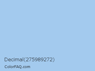 Decimal 275989272 Color is a light blue color and the nearest color is Baby Blue Eyes #a1caf1. Hex code #a3caee and RGB value is rgb(163,202,238). In RGB color space, this color is composed of 64% red, 79% green, 93% blue, In CMYK color space, this color is composed of 32% cyan, 15% magenta, 0% yellow , 7% black , In HSL color space, this color has a hue angle of 209° , 69% saturation and 79% lightness.