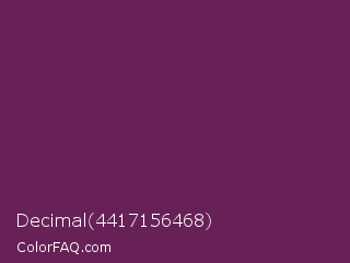 Decimal 4417156468 Color is a dark magenta color and the nearest color is Palatinate Purple #682860. Hex code #682156 and RGB value is rgb(104,33,86). In RGB color space, this color is composed of 41% red, 13% green, 34% blue, In CMYK color space, this color is composed of 0% cyan, 68% magenta, 17% yellow , 59% black , In HSL color space, this color has a hue angle of 315° , 52% saturation and 27% lightness.