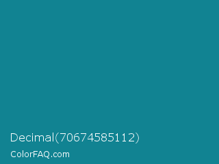 Decimal 70674585112 Color is a normal cyan color and the nearest color is Blue Chill #0c8990. Hex code #118392 and RGB value is rgb(17,131,146). In RGB color space, this color is composed of 7% red, 51% green, 57% blue, In CMYK color space, this color is composed of 88% cyan, 10% magenta, 0% yellow , 43% black , In HSL color space, this color has a hue angle of 187° , 79% saturation and 32% lightness.