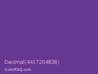 Decimal 4417204838 Color is a normal purple color and the nearest color is Rebecca Purple #663399. Hex code #683792 and RGB value is rgb(104,55,146). In RGB color space, this color is composed of 41% red, 22% green, 57% blue, In CMYK color space, this color is composed of 29% cyan, 62% magenta, 0% yellow , 43% black , In HSL color space, this color has a hue angle of 272° , 45% saturation and 39% lightness.