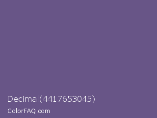 Decimal 4417653045 Color is a normal violet color and the nearest color is Dark Lavender #734f96. Hex code #685587 and RGB value is rgb(104,85,135). In RGB color space, this color is composed of 41% red, 33% green, 53% blue, In CMYK color space, this color is composed of 23% cyan, 37% magenta, 0% yellow , 47% black , In HSL color space, this color has a hue angle of 263° , 23% saturation and 43% lightness.