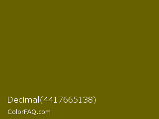Decimal 4417665138 Color is a very dark yellow color and the nearest color is Spicy Mustard #74640d. Hex code #686100 and RGB value is rgb(104,97,0). In RGB color space, this color is composed of 41% red, 38% green, 0% blue, In CMYK color space, this color is composed of 0% cyan, 7% magenta, 100% yellow , 59% black , In HSL color space, this color has a hue angle of 56° , 100% saturation and 20% lightness.