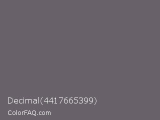 Decimal 4417665399 Color is a normal magenta color and the nearest color is Salt Box #685e6e. Hex code #686169 and RGB value is rgb(104,97,105). In RGB color space, this color is composed of 41% red, 38% green, 41% blue, In CMYK color space, this color is composed of 1% cyan, 8% magenta, 0% yellow , 59% black , In HSL color space, this color has a hue angle of 293° , 4% saturation and 40% lightness.