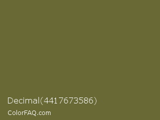 Decimal 4417673586 Color is a normal yellow color and the nearest color is Yellow Metal #716338. Hex code #686934 and RGB value is rgb(104,105,52). In RGB color space, this color is composed of 41% red, 41% green, 20% blue, In CMYK color space, this color is composed of 1% cyan, 0% magenta, 50% yellow , 59% black , In HSL color space, this color has a hue angle of 61° , 34% saturation and 31% lightness.
