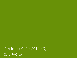 Decimal 4417741159 Color is a dark lime color and the nearest color is Limeade #6f9d02. Hex code #689107 and RGB value is rgb(104,145,7). In RGB color space, this color is composed of 41% red, 57% green, 3% blue, In CMYK color space, this color is composed of 28% cyan, 0% magenta, 95% yellow , 43% black , In HSL color space, this color has a hue angle of 78° , 91% saturation and 30% lightness.