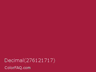Decimal 276121717 Color is a normal red color and the nearest color is Deep Carmine #a9203e. Hex code #a41b3b and RGB value is rgb(164,27,59). In RGB color space, this color is composed of 64% red, 11% green, 23% blue, In CMYK color space, this color is composed of 0% cyan, 84% magenta, 64% yellow , 36% black , In HSL color space, this color has a hue angle of 346° , 72% saturation and 37% lightness.