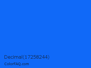 Decimal 17258244 Color is a normal blue color and the nearest color is Blue Ribbon #0066ff. Hex code #1069f8 and RGB value is rgb(16,105,248). In RGB color space, this color is composed of 6% red, 41% green, 97% blue, In CMYK color space, this color is composed of 94% cyan, 58% magenta, 0% yellow , 3% black , In HSL color space, this color has a hue angle of 217° , 94% saturation and 52% lightness.