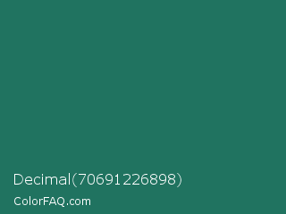 Decimal 70691226898 Color is a dark cyan color and the nearest color is Genoa #15736b. Hex code #207360 and RGB value is rgb(32,115,96). In RGB color space, this color is composed of 13% red, 45% green, 38% blue, In CMYK color space, this color is composed of 72% cyan, 0% magenta, 17% yellow , 55% black , In HSL color space, this color has a hue angle of 166° , 56% saturation and 29% lightness.