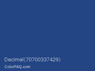 Decimal 70700337429 Color is a normal blue color and the nearest color is Bay Of Many #273a81. Hex code #244583 and RGB value is rgb(36,69,131). In RGB color space, this color is composed of 14% red, 27% green, 51% blue, In CMYK color space, this color is composed of 73% cyan, 47% magenta, 0% yellow , 49% black , In HSL color space, this color has a hue angle of 219° , 57% saturation and 33% lightness.