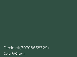 Decimal 70708658329 Color is a dark green color and the nearest color is Plantation #27504b. Hex code #305043 and RGB value is rgb(48,80,67). In RGB color space, this color is composed of 19% red, 31% green, 26% blue, In CMYK color space, this color is composed of 40% cyan, 0% magenta, 16% yellow , 69% black , In HSL color space, this color has a hue angle of 156° , 25% saturation and 25% lightness.