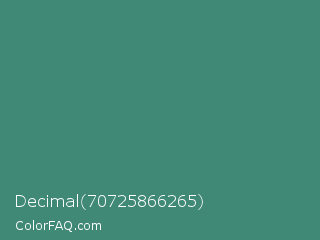 Decimal 70725866265 Color is a normal cyan color and the nearest color is Viridian #40826d. Hex code #408977 and RGB value is rgb(64,137,119). In RGB color space, this color is composed of 25% red, 54% green, 47% blue, In CMYK color space, this color is composed of 53% cyan, 0% magenta, 13% yellow , 46% black , In HSL color space, this color has a hue angle of 165° , 36% saturation and 39% lightness.