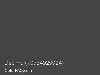 Decimal 70734929924 Color is a dark green color and the nearest color is Tundora #4a4244. Hex code #444544 and RGB value is rgb(68,69,68). In RGB color space, this color is composed of 27% red, 27% green, 27% blue, In CMYK color space, this color is composed of 1% cyan, 0% magenta, 1% yellow , 73% black , In HSL color space, this color has a hue angle of 120° , 1% saturation and 27% lightness.