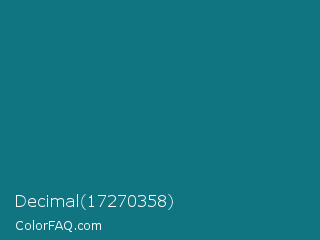 Decimal 17270358 Color is a dark cyan color and the nearest color is Surfie Green #0c7a79. Hex code #107580 and RGB value is rgb(16,117,128). In RGB color space, this color is composed of 6% red, 46% green, 50% blue, In CMYK color space, this color is composed of 88% cyan, 9% magenta, 0% yellow , 50% black , In HSL color space, this color has a hue angle of 186° , 78% saturation and 28% lightness.