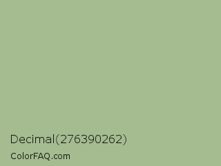 Decimal 276390262 Color is a light green color and the nearest color is Swamp Green #acb78e. Hex code #a4bc90 and RGB value is rgb(164,188,144). In RGB color space, this color is composed of 64% red, 74% green, 56% blue, In CMYK color space, this color is composed of 13% cyan, 0% magenta, 23% yellow , 26% black , In HSL color space, this color has a hue angle of 93° , 25% saturation and 65% lightness.