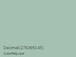 Decimal 276395145 Color is a light green color and the nearest color is Cambridge Blue #a3c1ad. Hex code #a4c1b1 and RGB value is rgb(164,193,177). In RGB color space, this color is composed of 64% red, 76% green, 69% blue, In CMYK color space, this color is composed of 15% cyan, 0% magenta, 8% yellow , 24% black , In HSL color space, this color has a hue angle of 147° , 19% saturation and 70% lightness.