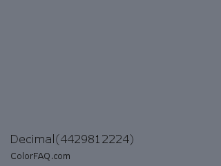 Decimal 4429812224 Color is a normal blue color and the nearest color is Pale Sky #6e7783. Hex code #717680 and RGB value is rgb(113,118,128). In RGB color space, this color is composed of 44% red, 46% green, 50% blue, In CMYK color space, this color is composed of 12% cyan, 8% magenta, 0% yellow , 50% black , In HSL color space, this color has a hue angle of 220° , 6% saturation and 47% lightness.