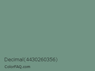 Decimal 4430260356 Color is a normal green color and the nearest color is Oxley #779e86. Hex code #719484 and RGB value is rgb(113,148,132). In RGB color space, this color is composed of 44% red, 58% green, 52% blue, In CMYK color space, this color is composed of 24% cyan, 0% magenta, 11% yellow , 42% black , In HSL color space, this color has a hue angle of 153° , 14% saturation and 51% lightness.