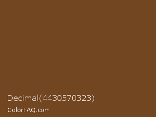 Decimal 4430570323 Color is a dark orange color and the nearest color is Pickled Bean #6e4826. Hex code #724621 and RGB value is rgb(114,70,33). In RGB color space, this color is composed of 45% red, 27% green, 13% blue, In CMYK color space, this color is composed of 0% cyan, 39% magenta, 71% yellow , 55% black , In HSL color space, this color has a hue angle of 27° , 55% saturation and 29% lightness.