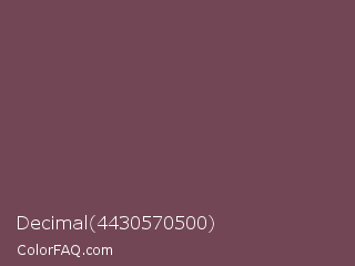 Decimal 4430570500 Color is a normal rose color and the nearest color is Ferra #704f50. Hex code #724654 and RGB value is rgb(114,70,84). In RGB color space, this color is composed of 45% red, 27% green, 33% blue, In CMYK color space, this color is composed of 0% cyan, 39% magenta, 26% yellow , 55% black , In HSL color space, this color has a hue angle of 341° , 24% saturation and 36% lightness.