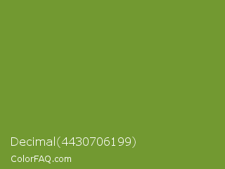 Decimal 4430706199 Color is a normal green color and the nearest color is Palm Leaf #6f9940. Hex code #729931 and RGB value is rgb(114,153,49). In RGB color space, this color is composed of 45% red, 60% green, 19% blue, In CMYK color space, this color is composed of 25% cyan, 0% magenta, 68% yellow , 40% black , In HSL color space, this color has a hue angle of 83° , 51% saturation and 40% lightness.