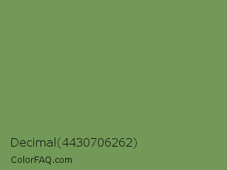 Decimal 4430706262 Color is a normal green color and the nearest color is Asparagus Green #7ba05b. Hex code #729958 and RGB value is rgb(114,153,88). In RGB color space, this color is composed of 45% red, 60% green, 35% blue, In CMYK color space, this color is composed of 25% cyan, 0% magenta, 42% yellow , 40% black , In HSL color space, this color has a hue angle of 96° , 27% saturation and 47% lightness.