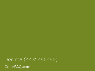 Decimal 4431496496 Color is a normal lime color and the nearest color is Wasabi #788a25. Hex code #738722 and RGB value is rgb(115,135,34). In RGB color space, this color is composed of 45% red, 53% green, 13% blue, In CMYK color space, this color is composed of 15% cyan, 0% magenta, 75% yellow , 47% black , In HSL color space, this color has a hue angle of 72° , 60% saturation and 33% lightness.