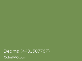 Decimal 4431507767 Color is a normal green color and the nearest color is Highland #6f8e63. Hex code #739151 and RGB value is rgb(115,145,81). In RGB color space, this color is composed of 45% red, 57% green, 32% blue, In CMYK color space, this color is composed of 21% cyan, 0% magenta, 44% yellow , 43% black , In HSL color space, this color has a hue angle of 88° , 28% saturation and 44% lightness.