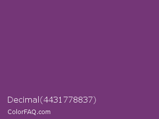Decimal 4431778837 Color is a normal magenta color and the nearest color is Maximum Purple #733380. Hex code #743677 and RGB value is rgb(116,54,119). In RGB color space, this color is composed of 45% red, 21% green, 47% blue, In CMYK color space, this color is composed of 3% cyan, 55% magenta, 0% yellow , 53% black , In HSL color space, this color has a hue angle of 297° , 38% saturation and 34% lightness.