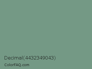 Decimal 4432349043 Color is a normal green color and the nearest color is Oxley #779e86. Hex code #749985 and RGB value is rgb(116,153,133). In RGB color space, this color is composed of 45% red, 60% green, 52% blue, In CMYK color space, this color is composed of 24% cyan, 0% magenta, 13% yellow , 40% black , In HSL color space, this color has a hue angle of 148° , 15% saturation and 53% lightness.