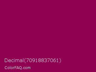 Decimal 70918837061 Color is a dark magenta color and the nearest color is Cardinal Pink #8c055e. Hex code #900151 and RGB value is rgb(144,1,81). In RGB color space, this color is composed of 56% red, 0% green, 32% blue, In CMYK color space, this color is composed of 0% cyan, 99% magenta, 44% yellow , 44% black , In HSL color space, this color has a hue angle of 326° , 99% saturation and 28% lightness.