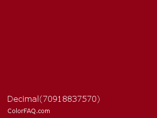 Decimal 70918837570 Color is a dark red color and the nearest color is Scarlett #950015. Hex code #900216 and RGB value is rgb(144,2,22). In RGB color space, this color is composed of 56% red, 1% green, 9% blue, In CMYK color space, this color is composed of 0% cyan, 99% magenta, 85% yellow , 44% black , In HSL color space, this color has a hue angle of 352° , 97% saturation and 29% lightness.