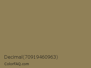 Decimal 70919460963 Color is a normal orange color and the nearest color is Dark Tan #918151. Hex code #908057 and RGB value is rgb(144,128,87). In RGB color space, this color is composed of 56% red, 50% green, 34% blue, In CMYK color space, this color is composed of 0% cyan, 11% magenta, 40% yellow , 44% black , In HSL color space, this color has a hue angle of 43° , 25% saturation and 45% lightness.