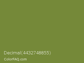 Decimal 4432748855 Color is a normal lime color and the nearest color is Palm Leaf #6f9940. Hex code #758939 and RGB value is rgb(117,137,57). In RGB color space, this color is composed of 46% red, 54% green, 22% blue, In CMYK color space, this color is composed of 15% cyan, 0% magenta, 58% yellow , 46% black , In HSL color space, this color has a hue angle of 75° , 41% saturation and 38% lightness.