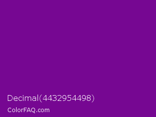 Decimal 4432954498 Color is a dark purple color and the nearest color is Purple #660099. Hex code #760792 and RGB value is rgb(118,7,146). In RGB color space, this color is composed of 46% red, 3% green, 57% blue, In CMYK color space, this color is composed of 19% cyan, 95% magenta, 0% yellow , 43% black , In HSL color space, this color has a hue angle of 288° , 91% saturation and 30% lightness.