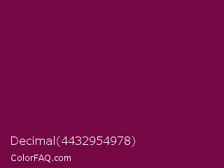 Decimal 4432954978 Color is a dark magenta color and the nearest color is Rose Bud Cherry #800b47. Hex code #760846 and RGB value is rgb(118,8,70). In RGB color space, this color is composed of 46% red, 3% green, 27% blue, In CMYK color space, this color is composed of 0% cyan, 93% magenta, 41% yellow , 54% black , In HSL color space, this color has a hue angle of 326° , 87% saturation and 25% lightness.