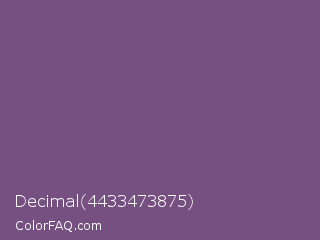 Decimal 4433473875 Color is a normal purple color and the nearest color is Affair #714693. Hex code #765081 and RGB value is rgb(118,80,129). In RGB color space, this color is composed of 46% red, 31% green, 51% blue, In CMYK color space, this color is composed of 9% cyan, 38% magenta, 0% yellow , 49% black , In HSL color space, this color has a hue angle of 287° , 23% saturation and 41% lightness.
