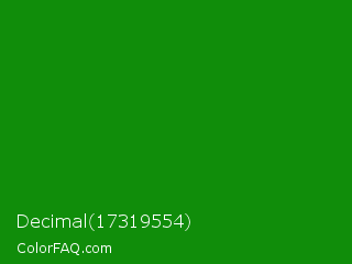 Decimal 17319554 Color is a dark green color and the nearest color is India Green #138808. Hex code #108d0a and RGB value is rgb(16,141,10). In RGB color space, this color is composed of 6% red, 55% green, 4% blue, In CMYK color space, this color is composed of 89% cyan, 0% magenta, 93% yellow , 45% black , In HSL color space, this color has a hue angle of 117° , 87% saturation and 30% lightness.