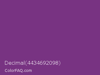 Decimal 4434692098 Color is a normal magenta color and the nearest color is Maximum Purple #733380. Hex code #783382 and RGB value is rgb(120,51,130). In RGB color space, this color is composed of 47% red, 20% green, 51% blue, In CMYK color space, this color is composed of 8% cyan, 61% magenta, 0% yellow , 49% black , In HSL color space, this color has a hue angle of 292° , 44% saturation and 35% lightness.