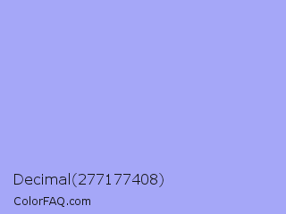 Decimal 277177408 Color is a very light blue color and the nearest color is Maximum Blue Purple #acace6. Hex code #a5a7f8 and RGB value is rgb(165,167,248). In RGB color space, this color is composed of 65% red, 65% green, 97% blue, In CMYK color space, this color is composed of 33% cyan, 33% magenta, 0% yellow , 3% black , In HSL color space, this color has a hue angle of 239° , 86% saturation and 81% lightness.